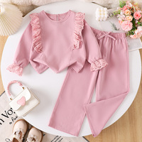 Catpapa 지역 창고 여아 캐주얼 핑크 레이스 라운드 넥 스웻셔츠 보우 롱 팬츠 봄 가을 세련된 투피스 세트